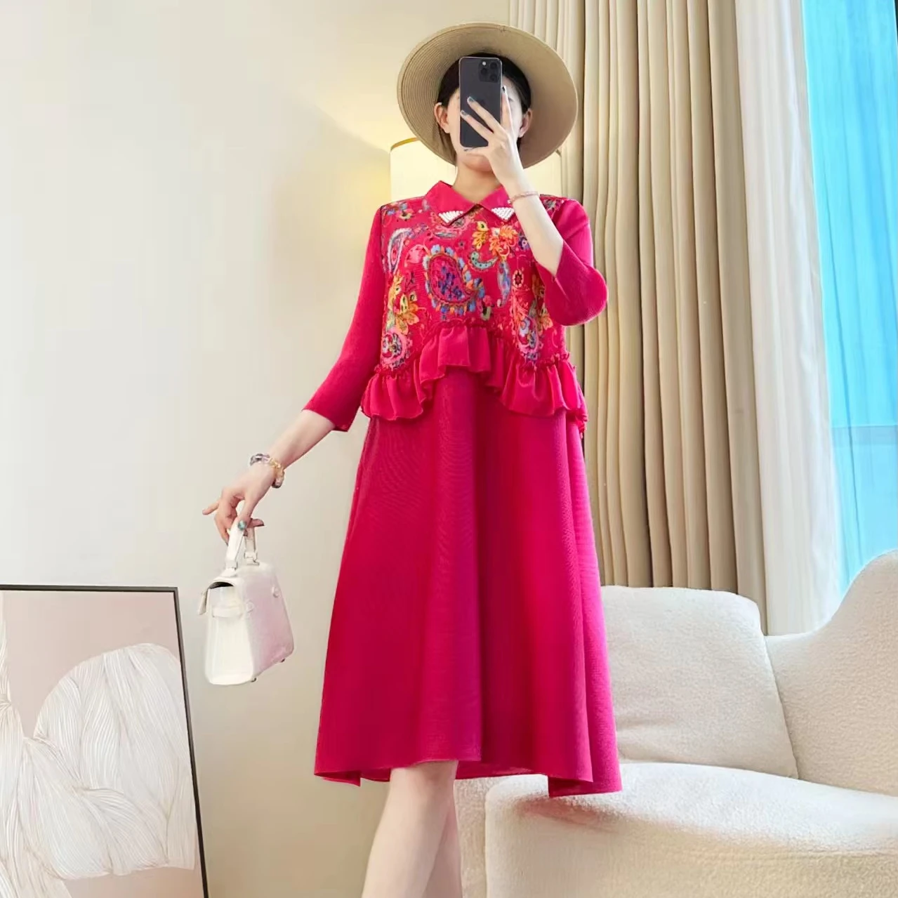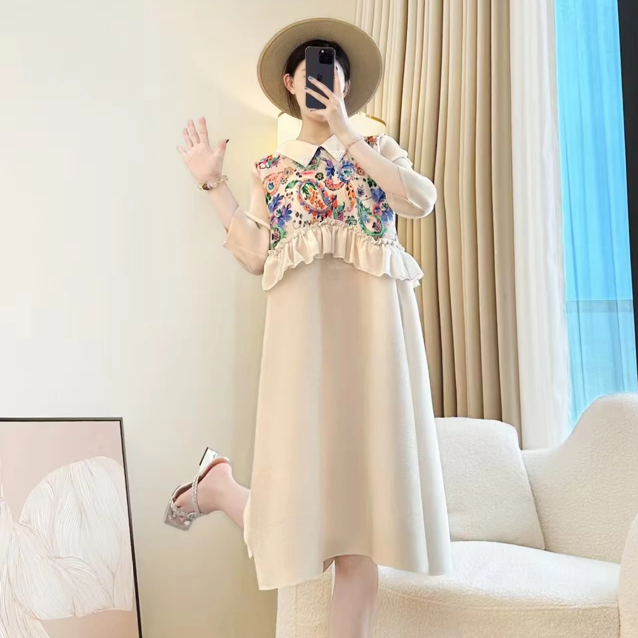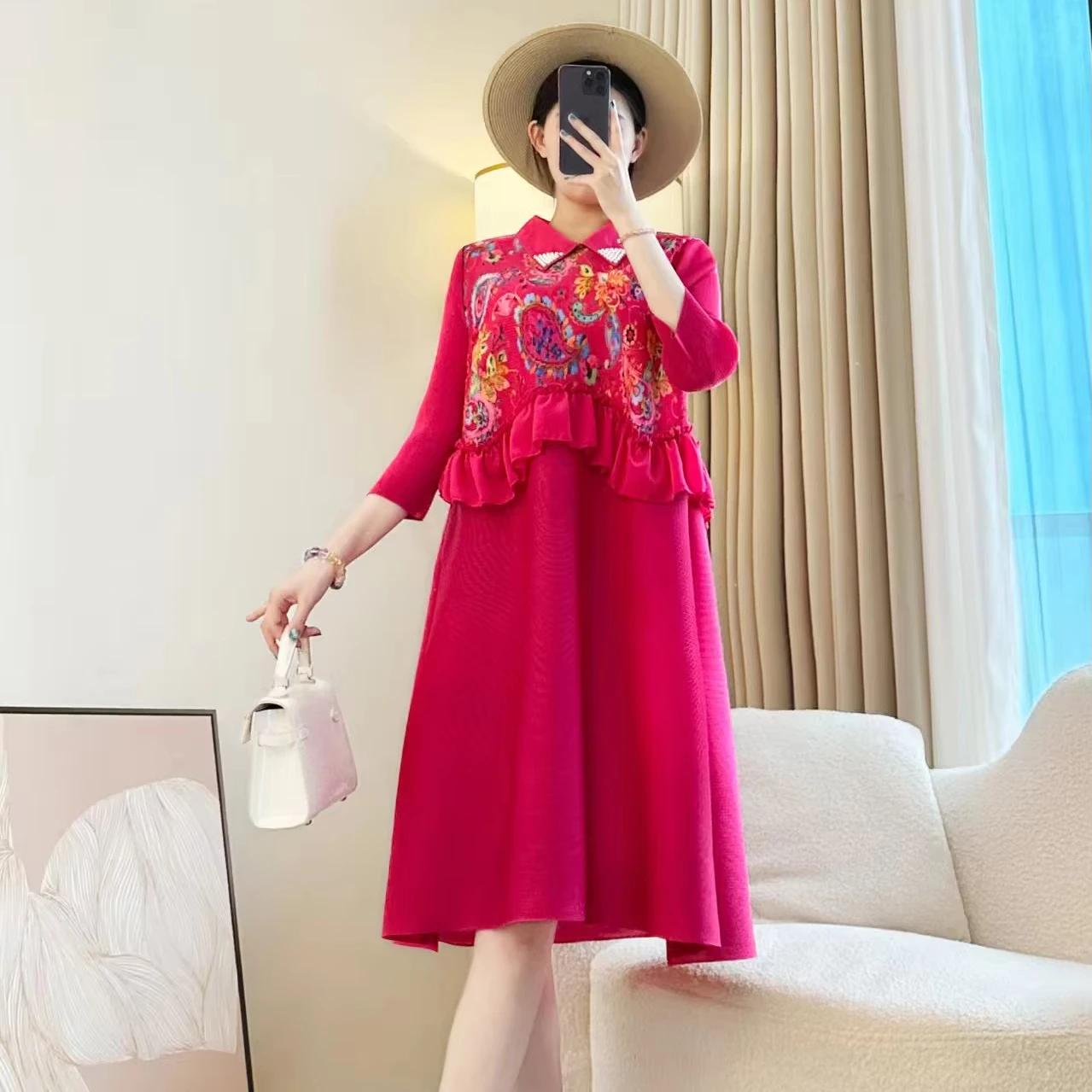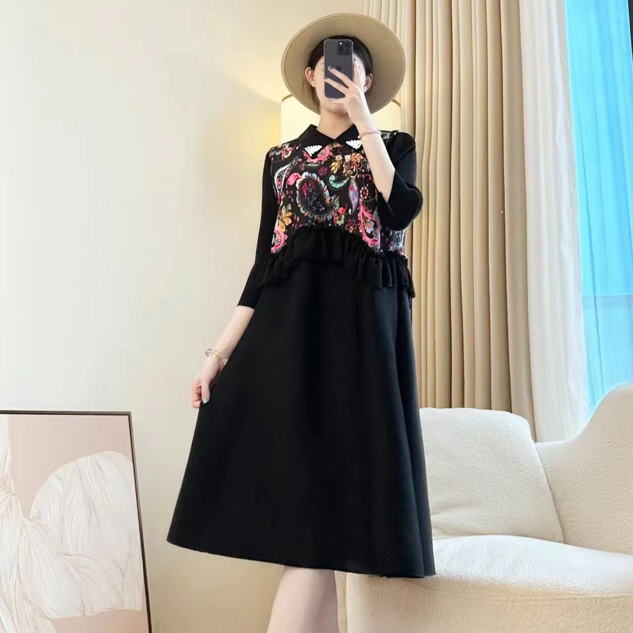 2025 Autumn Fashion Breathable Retro Printed Long Sleeve Midi-Length Lotus-Trim Casual Pleated Stitching Technique Floral